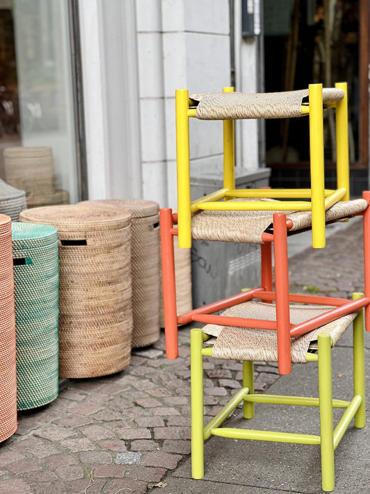 Vores skamler og taburetter er fremstillet i stål og teaktræ, hvilket sikrer både holdbarhed og et stilrent udtryk. Derudover tilbyder vi varianter med papirsflet i fem unikke farver: limegrøn, gul, rød-orange, off-white og blå. Hvis du foretrækker et mere klassisk look, har vi en skammel flettet cognagfarvet læder.