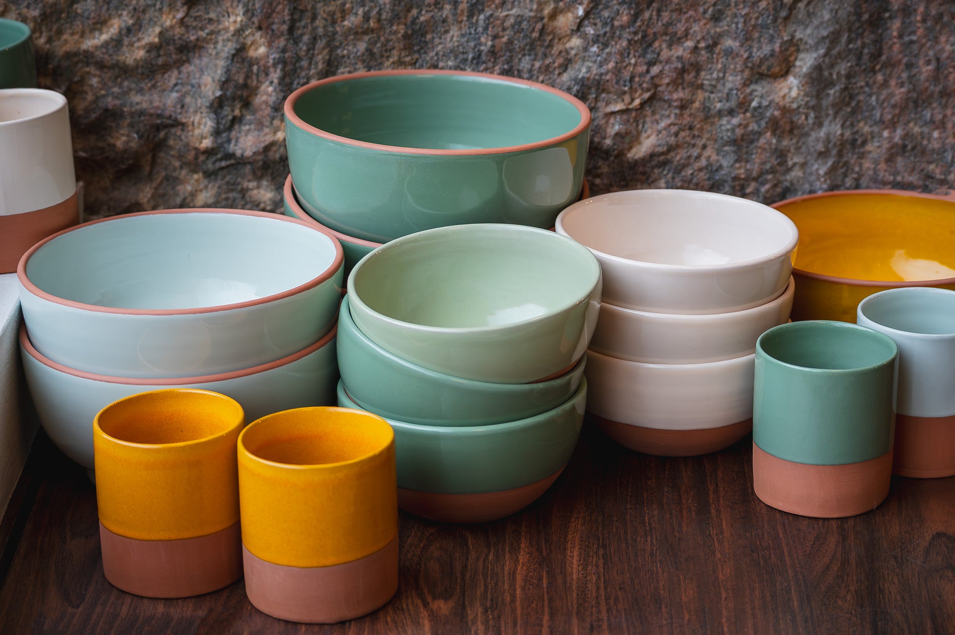 Vores keramik kopper er hånddrejet i Nordafrika og er udviklet i et tæt designsamarbejde for at sikre det helt rette udtryk. Hver kop er karakteriseret ved en elegant halvglasering i toppen, der står i smuk kontrast til den rå, ubehandlede lerbund og fremhæver materialets naturlige struktur.