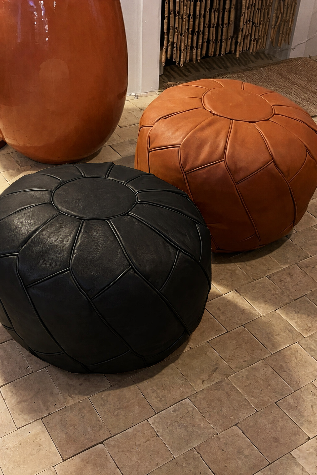 Puffen er håndlavet i Marokko på en lille produktion, hvor hver enkelt puf bliver omhyggeligt fremstillet i 100% okseskind. Fyldet består af genbrugte bomuldsrester fra tøjindustrien, hvilket sikrer, at puffen holder sin faste form over tid.