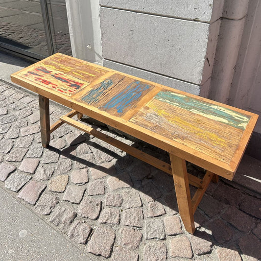 Ønsker du en bæredygtig løsning, tilbyder vi bænke i genbrugstræ fra gamle skibe, hvor hver model har sin egen unikke karakter. Disse bænke passer perfekt til dig, der ønsker et mere rustikt udtryk i din boligindretning.