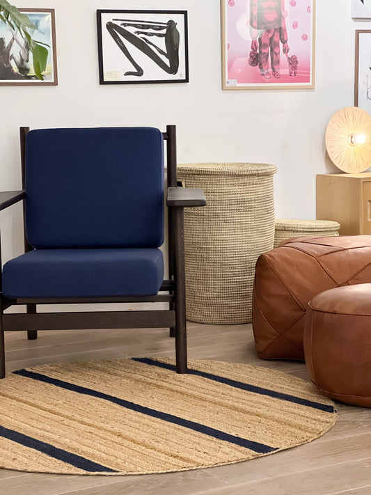 Rundt Jute Gulvtæppe - Natural with Blue & Yellow Stripes - Ø130cmNormalpris 795,00 DKKNormalprisStykpris / pr.