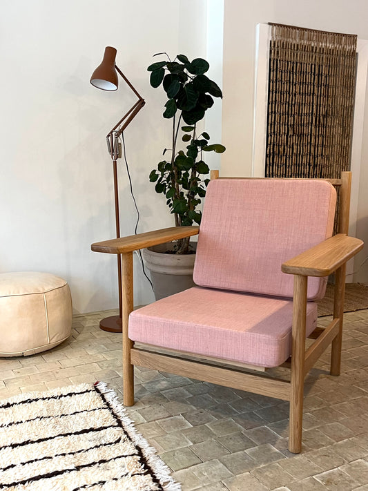 Stolene er fremstillet i solidt egetræ, hvilket sikrer både holdbarhed og et naturligt, tidløst udtryk. De er oftest ikke polstrede på forhånd, hvilket giver dig friheden til selv at vælge hynder i Hallingdal uld fra Kvadrat, som vi polstrer på vores eget værksted i København. Dermed kan du tilpasse farven, så stolen passer perfekt ind i din boligindretning.
