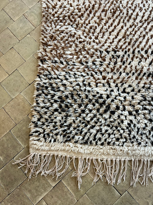 Beni Ouarain tæpper er blandt de mest populære marokkanske tæpper, kendt for deres bløde uld, enkle mønstre og tidløse æstetik. Disse tæpper er traditionelt vævet i en naturlig cremefarve med sorte eller mørke linjer, hvilket giver dem et stilrent og minimalistisk udtryk, der passer perfekt til både moderne og klassiske indretninger.