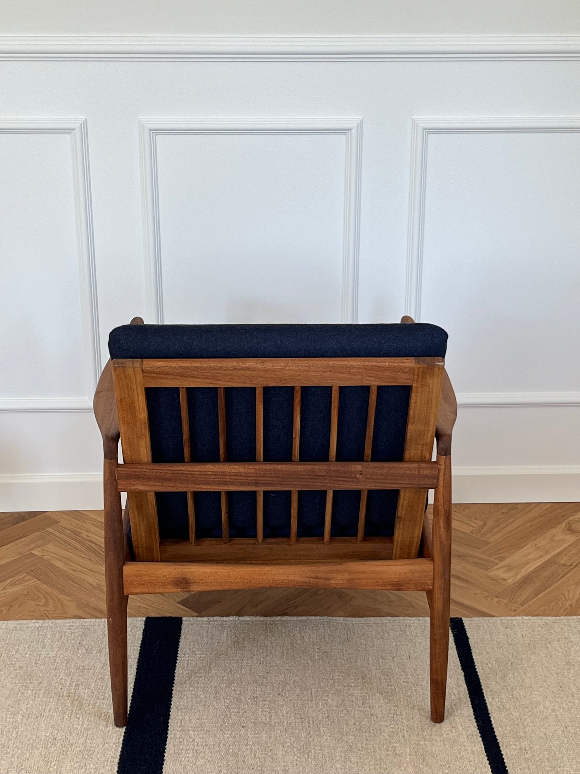 Lænestol i massiv akacie med to hynder betrukLænestol i massiv akacie med to komfortable hynder betrukket i slidstærkt uldstof. Det klassiske design fremhæves af smukt afrundede armlæn, som giver både stil og komfort.