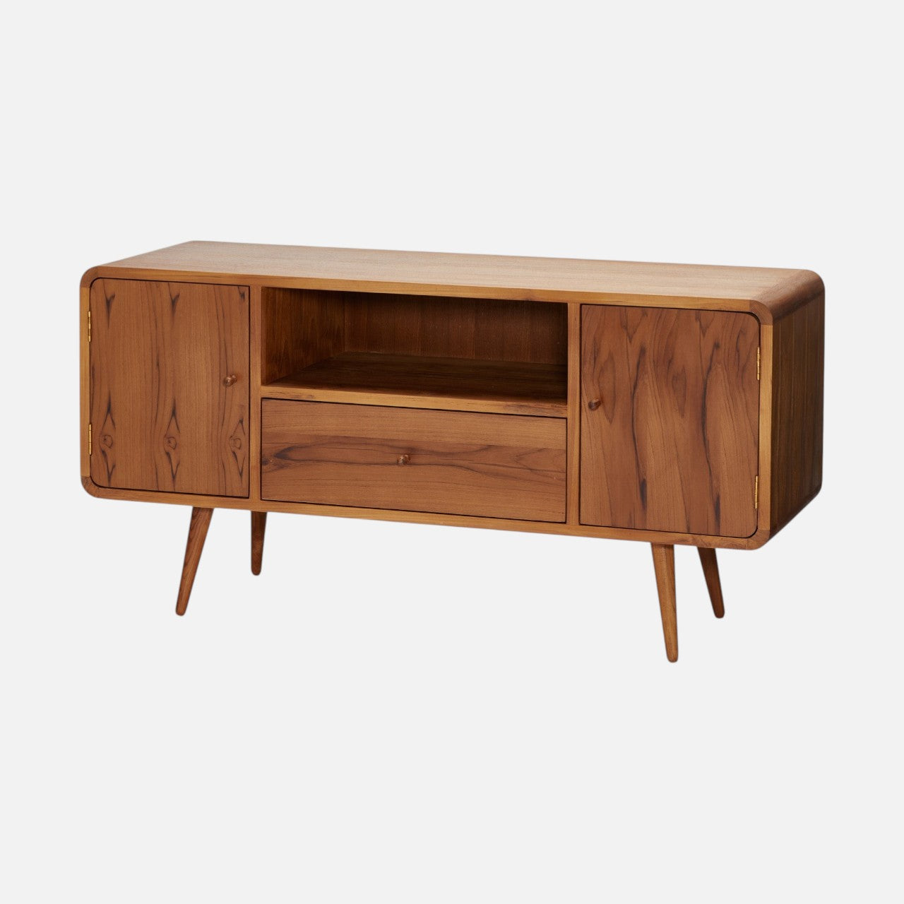 Elegant skænk i teakfinér med smukke runde hjørner i massiv teaktræ, der giver møblet et blødt og eksklusivt udtryk. Designet er enkelt og stilrent med klare retroreferencer, inspireret af klassisk skandinavisk møbeldesign.