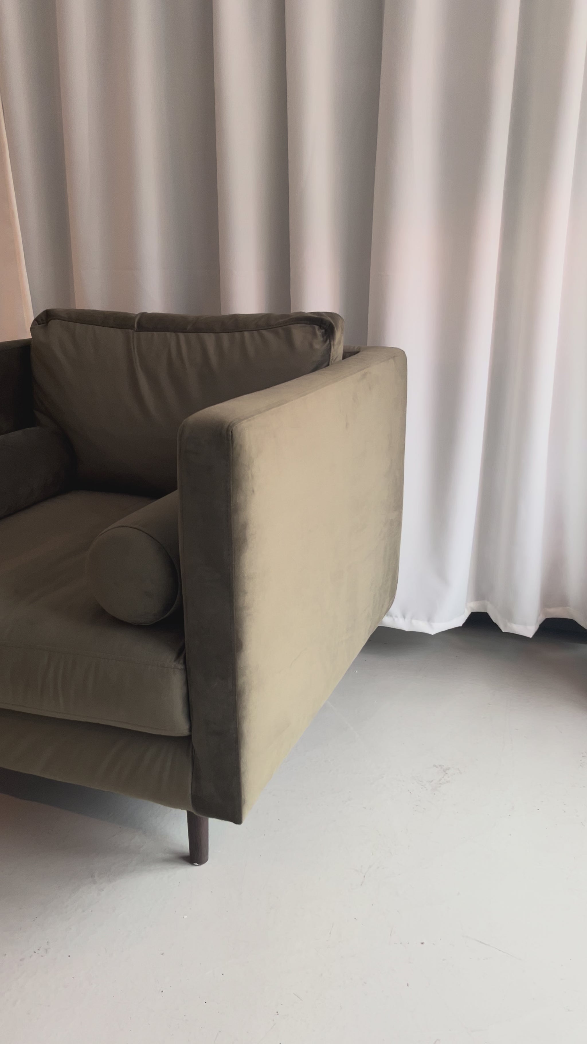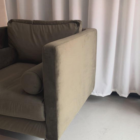 Lænestol betrukket i mørkegrøn velour. Stolen har bløde, runde puder, der giver god siddekomfort, og ben i mørkt træ, som skaber en fin kontrast til stoffet. Velegnet til stue, læsehjørne eller soveværelse. Som udstillingsmodel kan der forekomme mindre brugsspor.