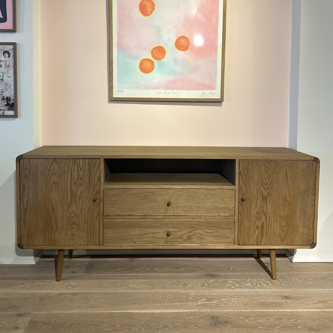 Designet er enkelt med retro referencer. Skænken har en smal dybde, hvilket gør den velegnet til mindre rum.